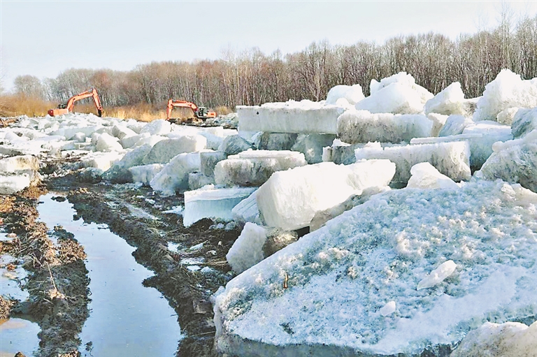 28日,在北大荒农业股份八五六分公司水库渠首,两台挖掘机正昼夜不停进行破冰作业,为春季水库引水蓄库打好提前量,保障春耕生产用水安全。