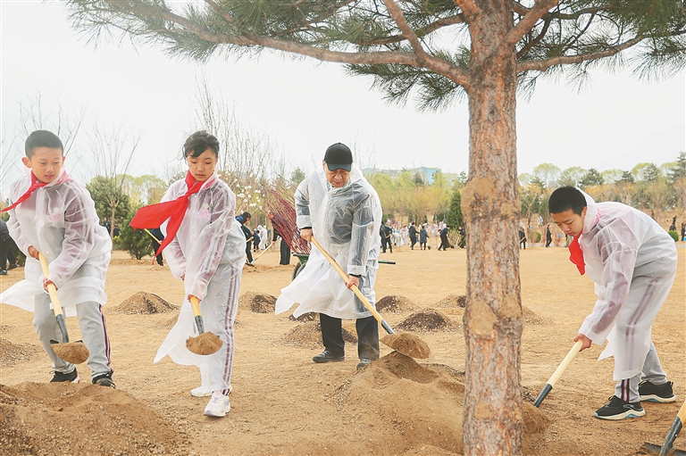 植树点位于北小河和坝河交汇处的东坝中心公园内,面积约300亩。该地块原为东坝乡东风村所在地,经搬迁腾退和环境整治,正在规划构建以生物多样性为特色的生态空间。东坝中心公园内,参加义务植树的首都干部群众、少先队员正干得热火朝天。