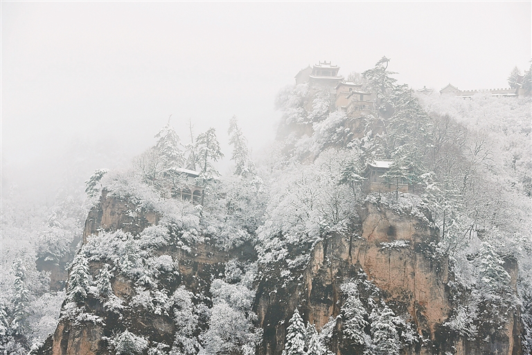 受冷空气影响,甘肃省平凉市迎来降雪,雪后的崆峒山银装素裹,宛如水墨画卷。 新华社发