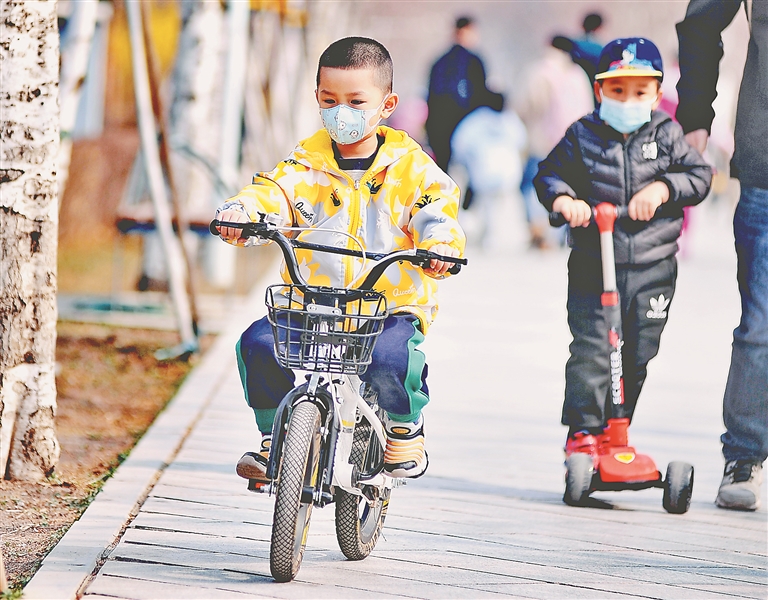 还有家长带着孩子玩滑板车、骑自行车、放风筝。一些市民结伴而行,徒步健身。在和煦春风的吹拂下,小草钻出泥土,树枝上长出嫩叶,到处是一片生机盎然的景象。本报记者 苏强摄