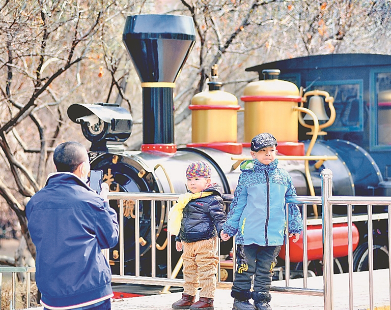 在哈尔滨市儿童公园内,经过一冬休整的小火车于5日正式发车,投入运营。一些家长带着孩子乘坐小火车游览园内的风光,在车站里,许多市民与小火车拍照留念。