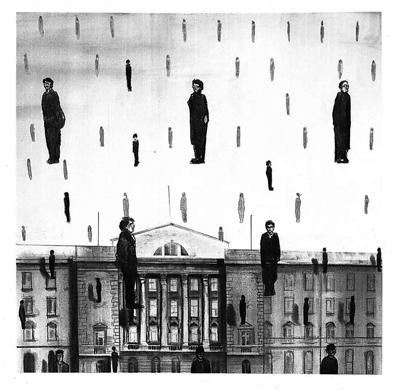 艺术家王宁铅绘插图作品《一座神圣的“城堡”》 ,致敬雷尼·马格利特经典名作《戈尔康达》