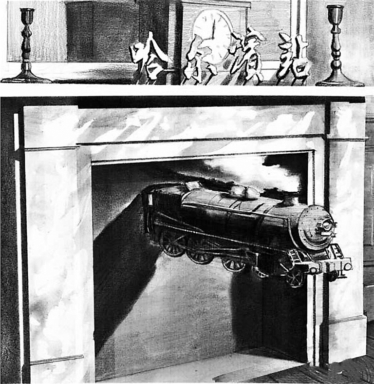 艺术家王宁铅绘插图作品《火车拉来的城市》 ,致敬雷尼·马格利特经典名作《被刺穿的时间》