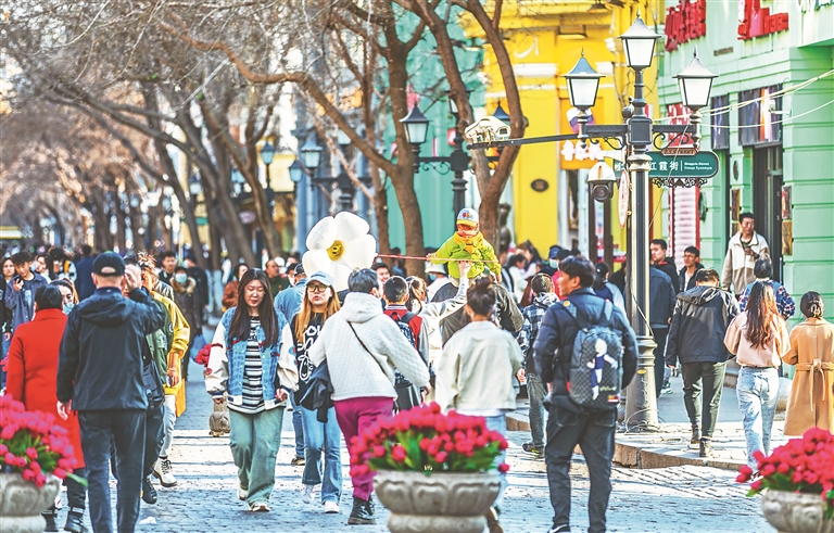 4月初,在哈尔滨百年老街中央大街上,轻便的春装、各色的裙裾、热销的冰棍、小朋友的笑脸……都展示着春天的来临。
