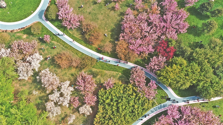 4月9日,游客在石家庄市栾城区樱花公园休闲游玩(无人机照片)。