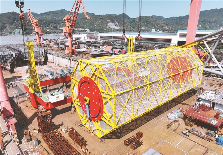 4月9日在马尾造船股份有限公司总组场地拍摄的“乾动2号”深远海养殖平台(无人机照片)。当日,“乾动2号”深远海养殖平台下水仪式在位于福建福州市连江县粗芦岛的马尾造船股份有限公司举行。