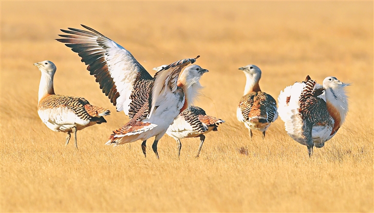 近日,12只大鸨出现在林甸县广林苗圃附近的草原上。它们追逐嬉闹,雄鸟翻开全身的羽毛,宛如开花般向雌鸟炫耀。大鸨是国家一级保护动物,雄鸟体重在10公斤左右,是地球上体重最大的鸟类之一。吴志林 本报记者 张澍摄