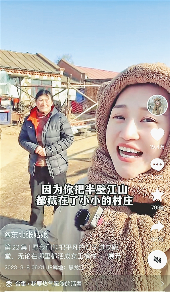 张涵有一种天然的乐观,铆足了劲儿决定试试。2022年11月,她和同乡好友组建团队,把抖音账号@东北张姑娘当成第一阵地,一边拍摄家乡风土人情,一边售卖家乡特产东北大米。几个月后,凭借富有文采的文案、真诚灿烂的笑容,张姑娘和东北大米收获了网友500多万次的点赞。她的劲头越来越足,主页赫然写道:“正努力热气腾腾地活着”。