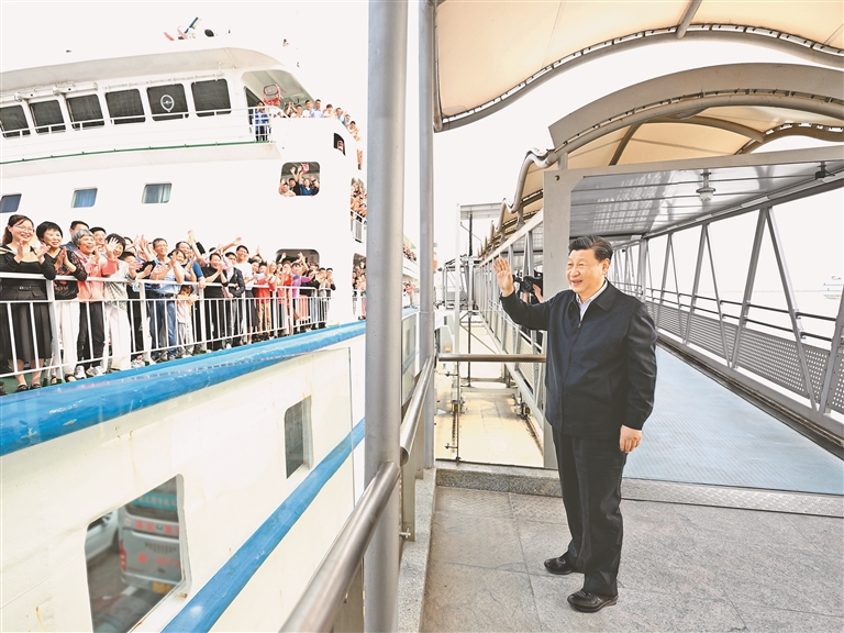 4月10日至13日,中共中央总书记、国家主席、中央军委主席习近平在广东考察。这是10日下午,习近平在湛江市徐闻县徐闻港泊位码头,向船上的旅客挥手致意。新华社记者 燕雁摄