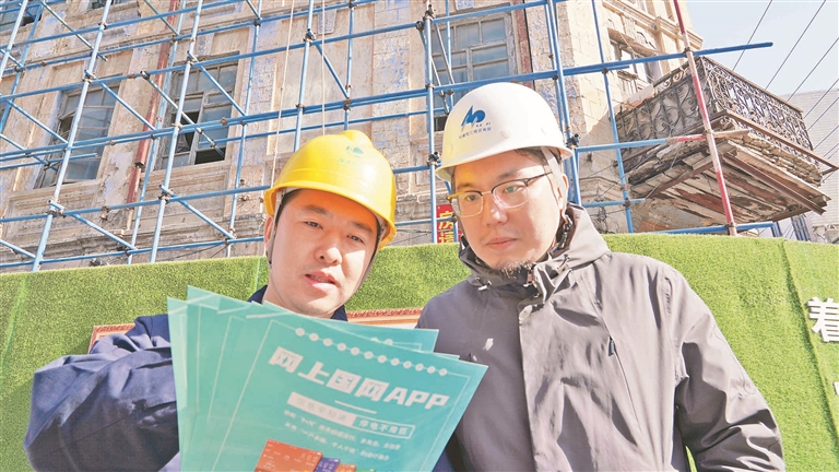 电力工作人员(左)现场服务中华巴洛克三期改造项目用电。