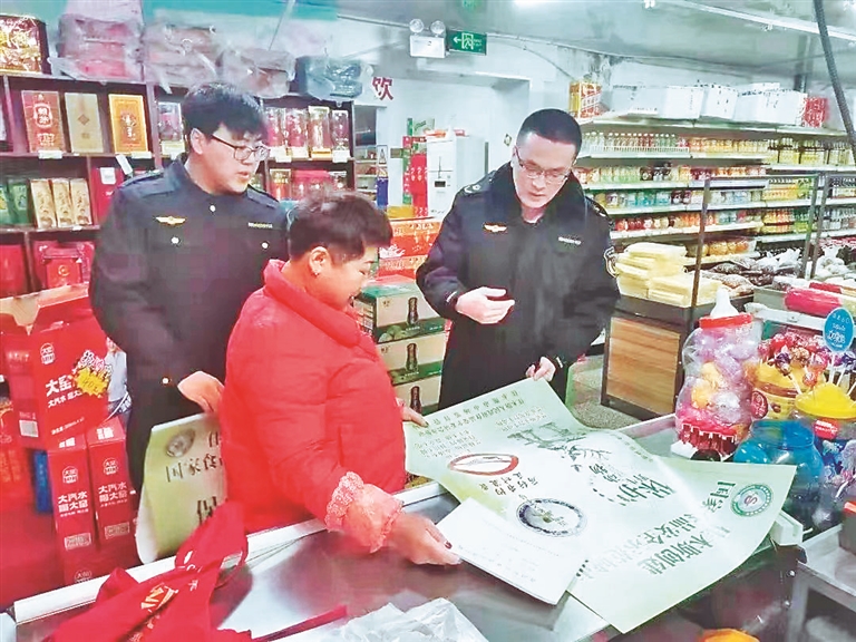 给商家发放创建国家食品安全城海报。 张大炜摄