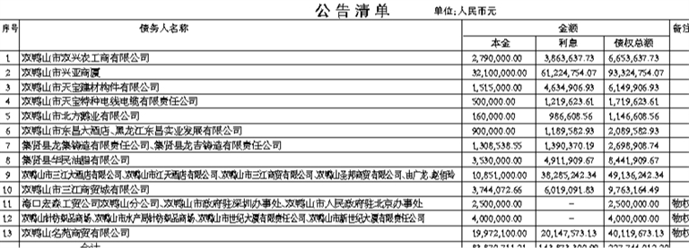 注:本公告清单仅列示截止2016年5月31日的本金余额,借款人和担保人及担保人的承继人应予偿还的利息余额按借款合同、担保合同及中国人民银行的有关规定计算。另债务已全部逾期,债务人已构成违约,请相关承债主体立即向中国长城资产管理股份有限公司黑龙江省分公司履行义务或承担清偿责任。(单位:人民币元)