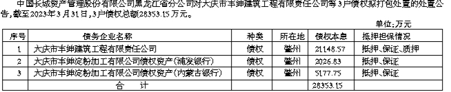 大庆市丰绅淀粉加工有限公司,截至2023年 3 月 31 日债权金额共计 2026.83万元,其中本金1022.10万元, 利息745.23 万元,孳生利息259.50万元,贷款方式为抵押、保证。保证人翟士伟、邢桂娟。抵押物为房产,面积4181.28平方米、土地使用权4310.8平方米,已办理房产、土地抵押登记。该项目位于大庆肇州,交通便利,易于变现。