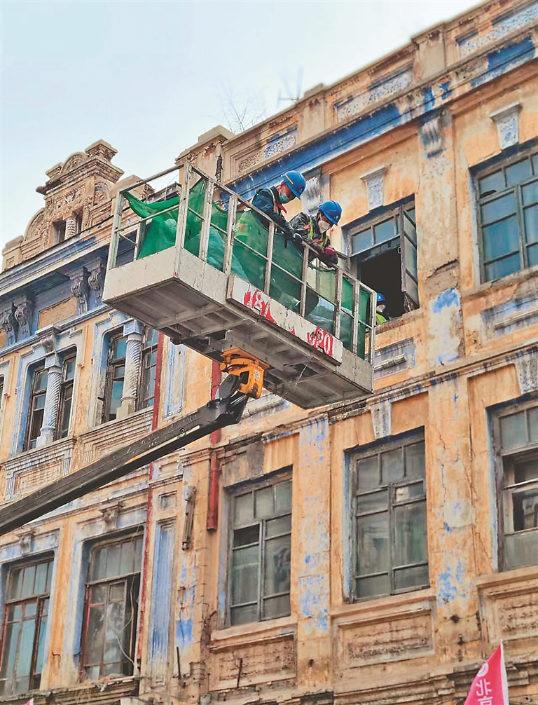 靖宇街上,一栋不可移动文物建筑正在修复中。该建筑顶层一处窗口外,站在高空作业车上的两名工人正与窗口内的工人合力清运建筑内的渣土垃圾。一袋袋渣土垃圾通过高空作业车运送下来,喷水除尘、装车苫盖后被运走。现场技术人员夏广臣告诉记者,这栋建筑建筑面积877平方米,有100年的历史,前身是亨得利钟表眼镜行。“从文物修缮角度来说,要更多保留原来的样式和风格,尽量用原来的工艺及材料更好地把历史信息传下去。”夏广臣说,这栋建筑有一定的形变和隐患,维修从基础到外围护墙,墙体要做加固,把一些旧的能使用的门窗尽量保留,更好地把遗存还原,缺失的部分就按照原来的样式工艺来进行一部分添配。