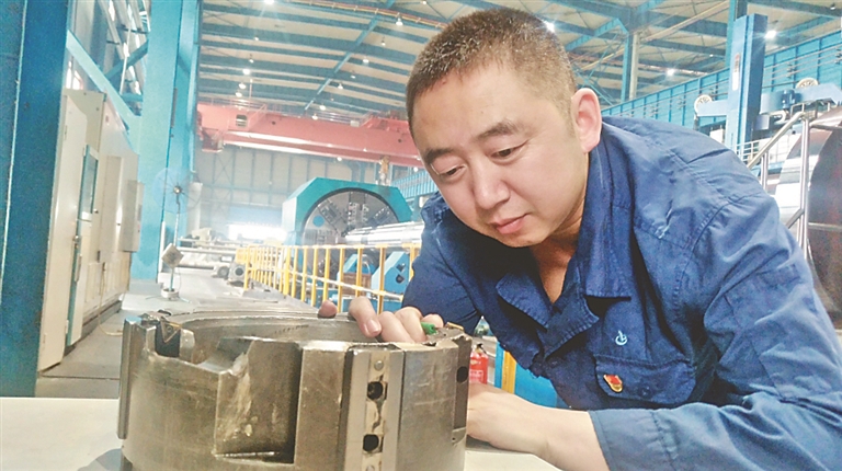 在一台大型数控机床前,桂玉松双眼紧盯一块重达百吨的实心钢坯,轻触操控案板,伴随着机床轻微的转动声,特制的刀具伴着润滑油,探入钢坯内部。