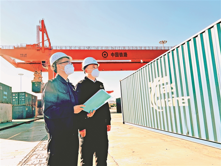 冰城海关驻香坊办事处关员对出境中欧班列运载货物实施现场监管。