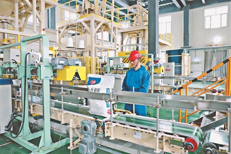在县域支柱企业——伊品生物氨基酸生产车间,随着机器的轰鸣,一袋袋苏氨酸成品通过传输带被送到成品库房。通过精深加工,普通的玉米在这里变成了苏氨酸、赖氨酸等产品,附加值提高了3倍。