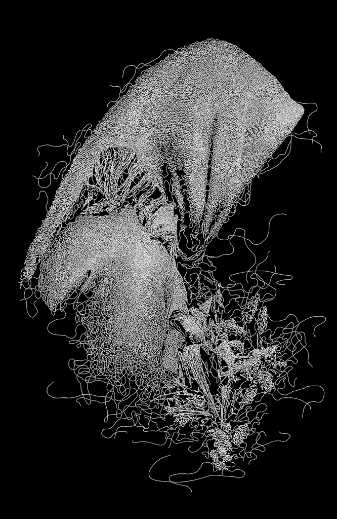 《厚土耘生》是这一系列“线条”版画中最具代表性的作品。同样是表现北方的农民,但这幅版画已经和之前相同题材的版画拉开了距离。黑白两种颜色是作品中仅有的色彩,大面积的“留黑”背景衬托了白色线条穿插而成的女性侧面肖像。女性的头上紧紧包裹着头巾,这是北方田间地头劳动妇女惯用的打扮。她的头向前微探,面目五官全部隐没于头巾之下,但神情却可想见——坚韧隐忍——如同黑土地上的每一位劳动者。作品在形式的探索上吸收了一些构成的元素,线条不同于素描中线固有的排列形式,而是像自然界中的植物,蕴涵着饱满膨胀的张力,蓬勃生长、交织缠绕,肆意地拆解人物,并剥离形和体、形和色的联结。线条连绵不断四下延伸,在右下方组成了一束植物,点明了农民与植物、与土地的亲密关系。谢崇塑造人物形象的能力在这幅作品里表露无遗,线条貌似杂乱无章,却不排斥物象,女性高贵的轮廓下隐藏着北方农民崇高的心灵。画面单纯强烈,写实写意、感性理性交织,给人以丰富想象的空间。