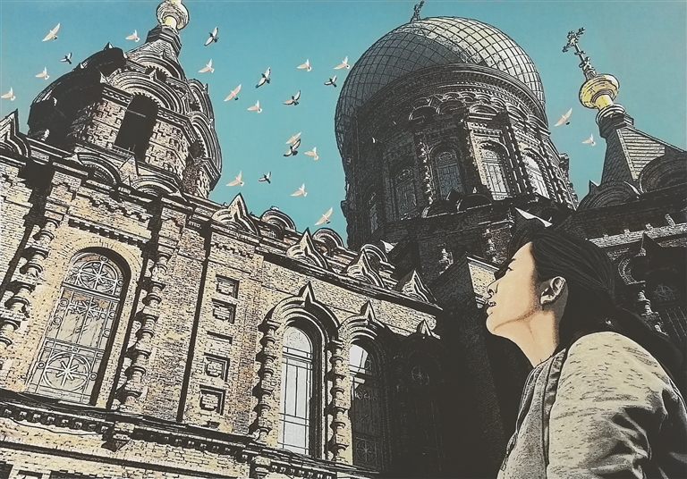 《圣·索菲亚》带领我们跟随一位少女,从侧面仰视的角度观赏着这座充满异域风情的建筑。天空中一群鸽子掠过教堂巨大的绿色洋葱头穹顶,画面动静结合、以动衬静,意象和形象和谐统一。在这幅版画中,谢崇展示出了精准的观察力和对细节的不懈追求。红砖套叠砌成的拱券、外墙面的装饰母体、窗子两侧方圆相连的壁柱,他一丝不苟地在再现着这座拜占庭式建筑的丰富细节。这座教堂是哈尔滨的地标性建筑,它见证了这座城市的历史变迁,更表明了哈尔滨对东西方文化的兼容并包。