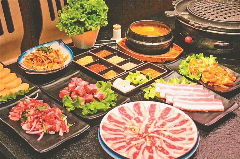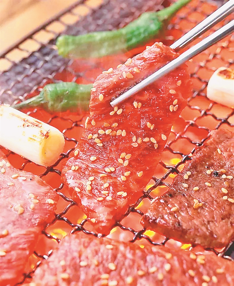 常常在晚上,窗外灯火辉映,店内宽敞明亮,好友家人围坐一方黄木底色烤桌,各人面前白碟中,鹅黄的坚果碎、暗灰的孜然、焦红的辣椒片、黑白芝麻相拌的干蘸料,或是韩式辣酱、老抽生鲜香料等汤蘸料,已按各自口味调制停当,目光也齐整整地转向了烤桌正中的烤盘上。