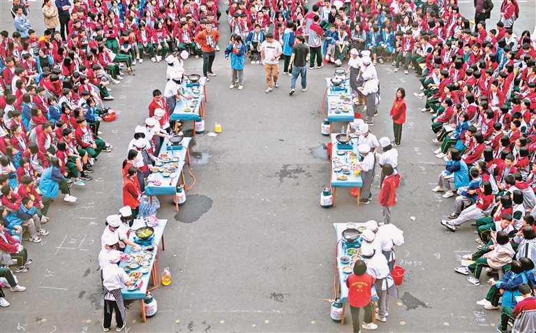当日,湖南省道县敦颐学校举办首届校园厨艺比赛,旨在增强学生的生活自理能力,培养学生的劳动意识和劳动技能。新华社发