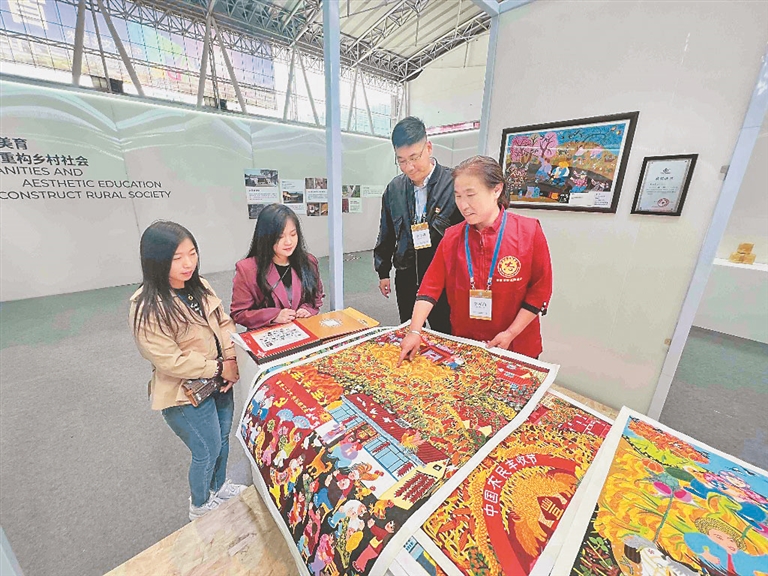 “我们在驻村工作时发现了郭丽华的情况,就想着帮忙把她的农民画打造成品牌,最终实现产业化,为农民增收开辟一条新路。”郭淼说,全力推动下,郭丽华成立了工作室,还走进了创博会,在展示作品的同时,也能开阔一下眼界,寻找更多的合作机会。