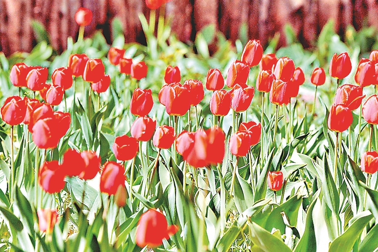 这些郁金香种植在公园内多个区域,红色的热情奔放、黄色的活泼鲜艳;在阳光照耀下,既绚丽迷人,又高贵典雅,成为公园里一道美丽风景。