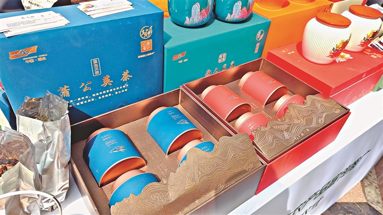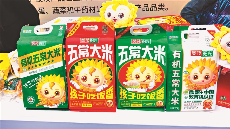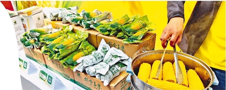 活动现场亮相的鲜食玉米、五常大米、蒲公英茶。 见习记者 唐海兵摄