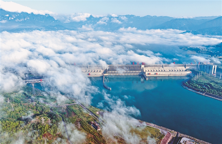 当日,湖北宜昌雨过天晴,三峡上空云雾缭绕,美景如画。