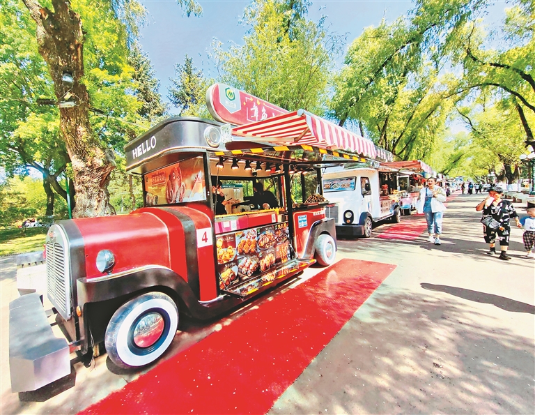 22日,哈尔滨市太阳岛公园内,20多辆美食车一字排开,车内销售的各种美食吸引了许多游人购买。烤鱿鱼、烤红肠、羊肉串、铁板烧等美食散发着诱人的香味;冰粉、冰淇淋、冷饮等为夏日里的人们带来更多清凉。这些美食车外形卡通十分可爱,其本身也成为了园内一道美丽风景。一位外地游客说,来太阳岛游玩不仅饱了眼福,还享了口福,真是不虚此行。
