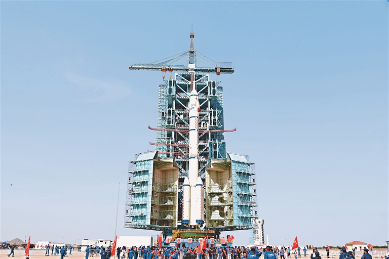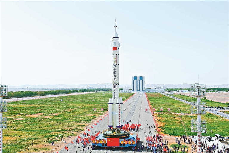 神舟十六号载人飞船与长征二号F遥十六运载火箭组合体转运至发射塔架。