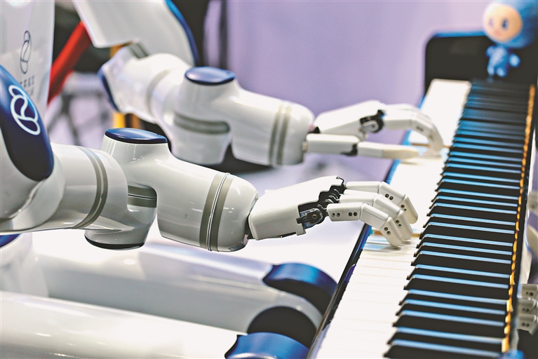 左图为机器人在峰会现场弹奏钢琴。