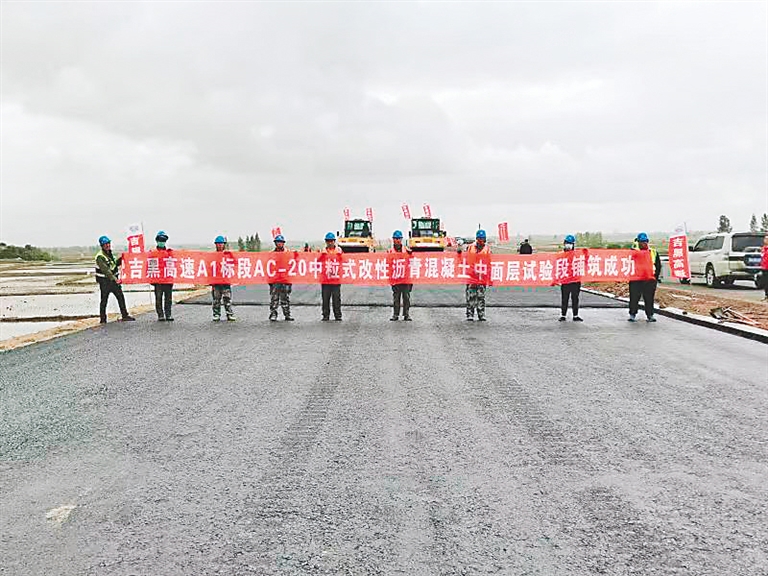 2023年5月21日,中国铁建大桥局负责施工的吉黑高速A1标段AC-20中粒式改性沥青混凝土中面层试验段铺筑成功。试验段总长300米,项目共投入拌合楼、摊铺机、压路机等大中型设备33台套进行同时作业。