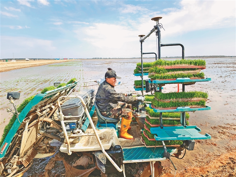 连日来,在北大荒集团八五九农场有限公司第一管理区的有机生态种植基地,插秧机缓缓走过,株株新绿随之横平竖直地镶嵌在黑土地上。而与此同时,在距离此4000多公里的海南省的岳莉正通过“乌苏里江大米”的微信小程序观看这一场景。