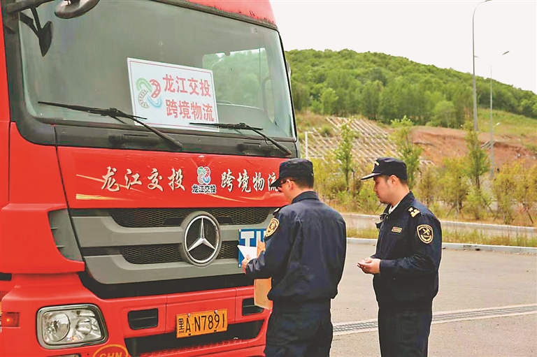 26日上午,龙运集团工作人员通过TIR电子预申报系统,将要出口的岩棉条等相关信息上传报送,绥芬河海关关员对货物单证等信息进行核验,符合要求并铅封后予以放行。