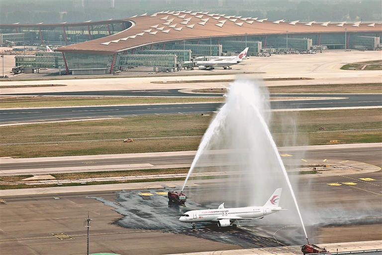 ③北京首都国际机场以水门礼迎接C919。