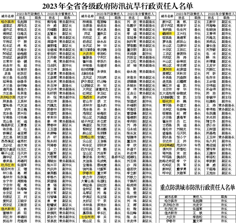 根据《中华人民共和国防洪法》《中华人民共和国防汛条例》《中华人民共和国抗旱条例》和《黑龙江省实施〈中华人民共和国防洪法〉条例》关于防汛抗旱工作实行各级人民政府行政首长负责制的规定,现将2023年全省各级政府防汛抗旱行政责任人和重点防洪城市行政责任人名单予以通报。责任人如有调整变化,原则上由所在单位接任领导替补,不再另行通报。
