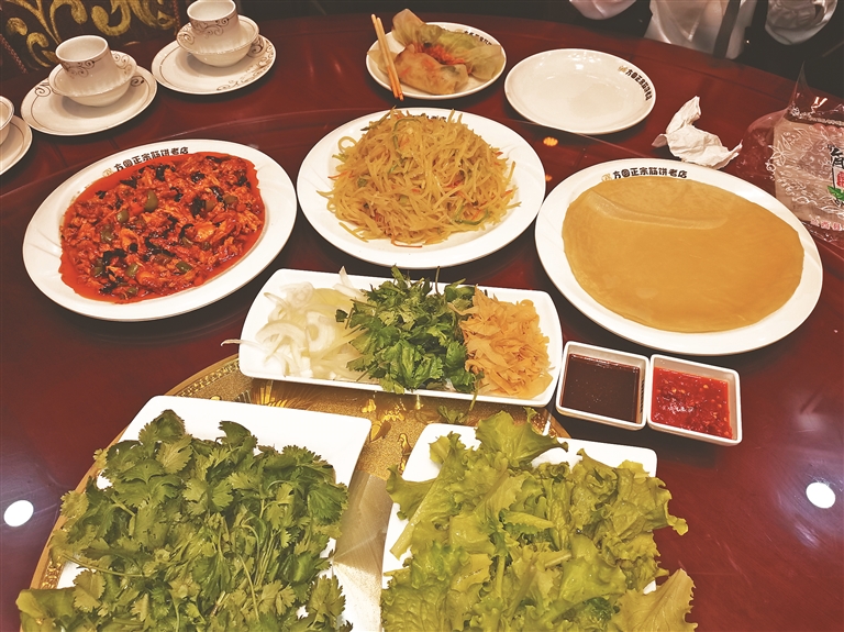 接下来,你可以选择用筋饼卷香辣肉丝、京酱三丝等各种“丝”,还可辅以酱炒蛋、猪头肉,甚至酸菜粉。