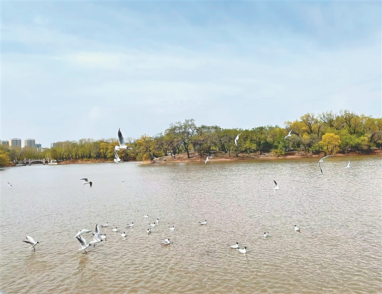 走下望江楼,来到劳动湖畔,这里众多的红嘴鸥在湖面上起起落落,不时从蔚蓝的湖面上叼起小鱼,惹得众多游人久久驻足。我还是第一次这么近距离看到鸥,深褐色的头罩延伸至顶后,嘴及脚红色,翼前缘白色,翼尖的黑色并不长,这是一种非常漂亮的鸟,听说红嘴鸥是鹤城的明星,还上过央视纪录片《自然的力量》呢。龙沙公园的一山一水、一亭一阁,都如此和谐,让人赏心悦目。