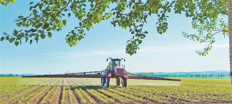 一台喷杆长28米的哈迪风幕式喷药机正在北大荒集团八五五农场有限公司大田里进行灭草作业。农业技术人员介绍,这样使用不仅能提高作业标准,减少药品用量20%,还是落实农业“三减”措施的好帮手。