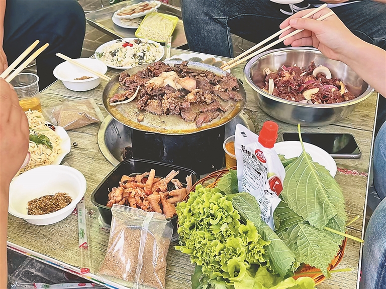 进入3月后,齐齐哈尔各烤肉店的客流就持续攀升,尤其省内短线游出现井喷。据当地商务和旅游部门的不完全统计,今年“五一”假日期间,齐齐哈尔烤肉门店日均收入普遍同比增长3倍~4倍,累计接待外来游客20万人次。截至5月末,八成游客来自哈尔滨、大庆、绥化、黑河等地。进入6月后,外省游客明显增加。其中,有多次网购齐齐哈尔烤肉,周末驱车500多公里现场体验的;有循着探店网红、吃播、网站热帖等足迹而来,只为这一口无肉不欢;还有带家人来逛吃的……