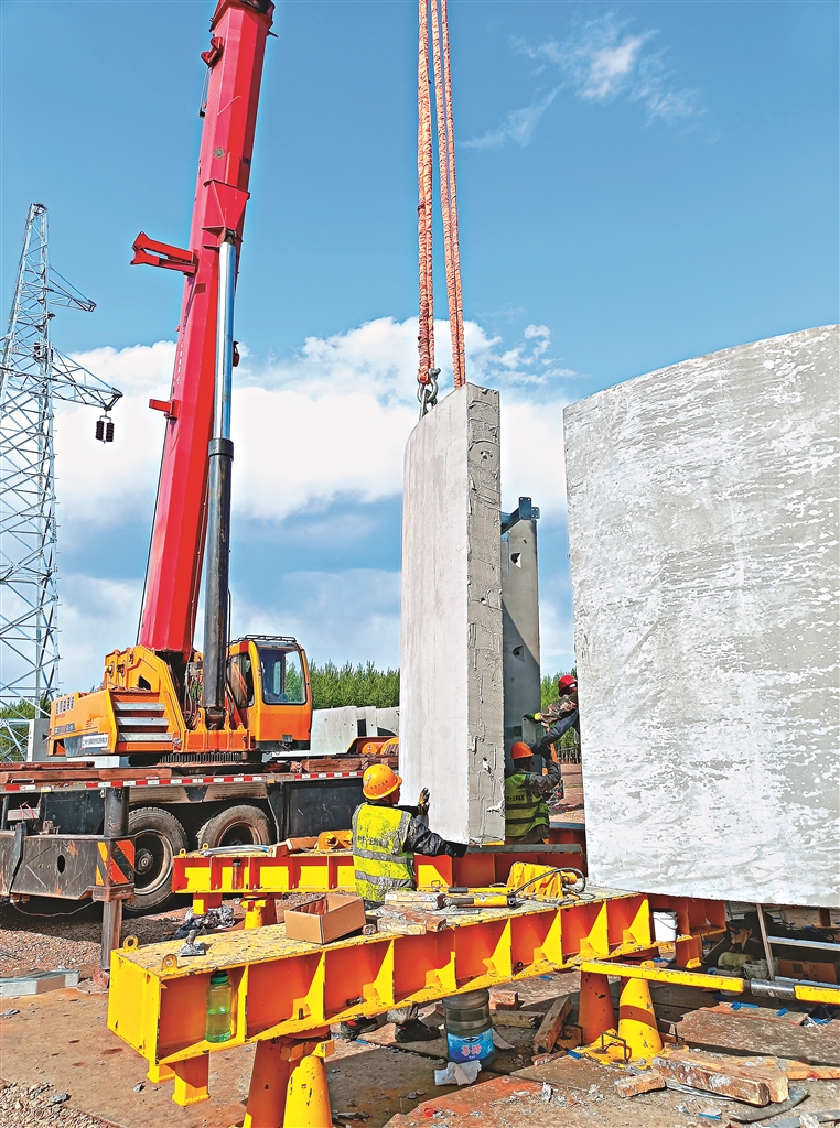 一重上电能源综合利用项目(一期)工人正在进行风机混搭拼接作业。