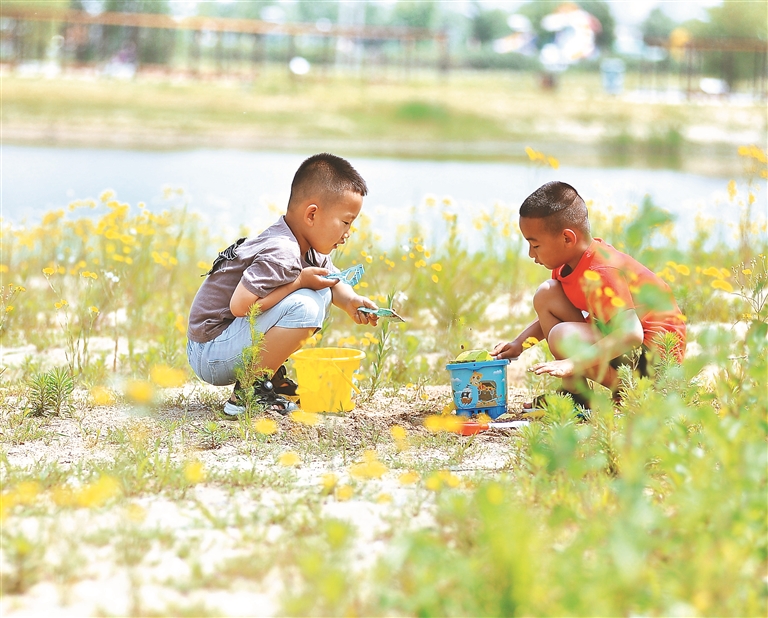 人们有的在观光栈桥行走,有的在岸边赏花观景,有的在忙着野餐。最欢乐的是孩子们,他们玩沙子、玩滑板车……奔跑着,欢笑着,度过快乐的假日。