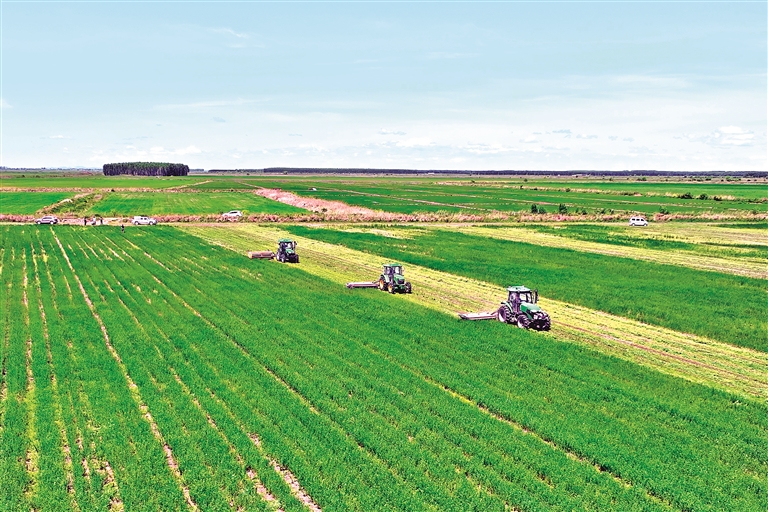 天空一碧如洗,温暖的阳光照在一望无垠的黑土地上。北大荒集团军川农场有限公司高产优质苜蓿示范田里,被誉为“牧草之王”的紫花苜蓿流青溢翠,花蕾摇曳,已经长到70厘米高,迎来了头茬收获期。