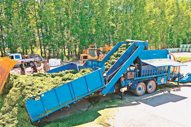 绿原管理区党支部书记王金说:“我们引导种植户积极使用新技术新方法,在今年的苜蓿收储过程中,使用新型青储裹包机进行作业,它的优势,一是自动完成各项工序,减少了人工成本;二是青贮经过紧密包裹,有效避免了窖储方式导致的二次发酵;三是减少了储存的占地面积,运输便利。”