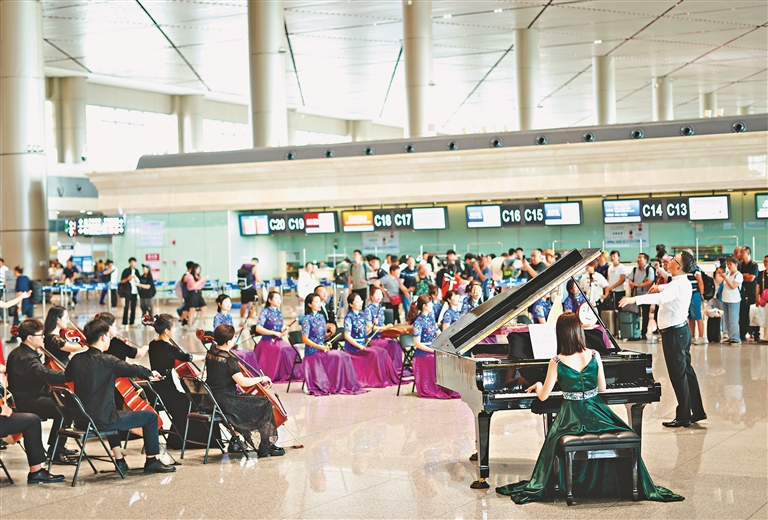 “刚出通道就听到了那首熟悉的《太阳岛上》,最令人欣喜的是这首曲子的演绎居然加入了民乐的演奏方式,太有创意了。哈尔滨人对音乐的热爱太具有感染力了。”从广州来哈开会的姜毅刚下飞机就被大厅的一场演奏深深吸引了。吸引姜先生的是哈尔滨演艺影视集团“七一”前夕在哈尔滨太平国际机场候机楼举行的《我和我的祖国》快闪活动。