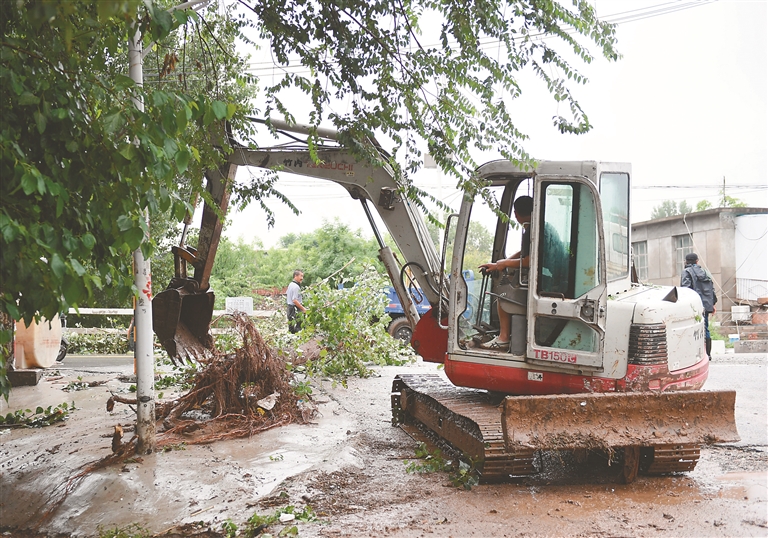 8月1日,在北京市房山区青龙湖镇上万村,工作人员清理倒伏树木。 新华社发