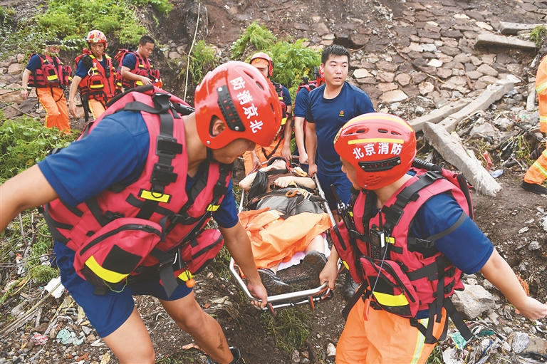 8月1日,在北京市门头沟区水峪嘴村,在此增援的北京大兴区消防救援支队的消防员在转运一名受伤村民。