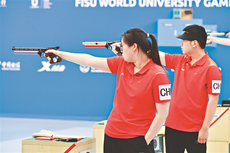 2日,在大运会射击项目10米气步枪混合团体决赛中,由张雨/宋布寒组成的中国队获得冠军,这也是中国队赢得的本届大运会射击比赛的第五枚金牌。