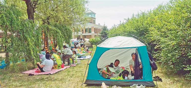 田园风光、采摘骑马、音乐美食……走进哈尔滨市天鹅湖庄园,市民王嘉一家老小坐在天幕帐篷下露营烧烤,“这里就是个天然氧吧,拉开帐篷,一股山林间特有的清新扑面而来,让我突然就有了‘采菊东篱下,悠然见南山’的心境。”记者环顾四周发现,像王嘉这样慕名前来露营的游客不在少数。园区负责人吕秋梦告诉记者,天鹅湖庄园结合游客需求,推出木屋、帐篷等特色各异、主题多元的露营体验,还策划了亲子露营、电音节等系列活动,并在去年原有游玩项目的基础上还新增了骑马、浆板项目等,让更多的市民及游客领略生态之美,尽享夏日林荫的清凉。